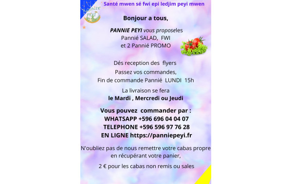 Bienvenue dans la Boutique de Pannié Péyi. Vous y trouverez les paniers de la semaine contenant salades, fruits, légumes ou le tout à la fois, fonction de vos envies et surtout vos besoins. Les produits que nous vous proposons sont issus de chez nous, la Martinique, et principalement de l’agriculture biologique