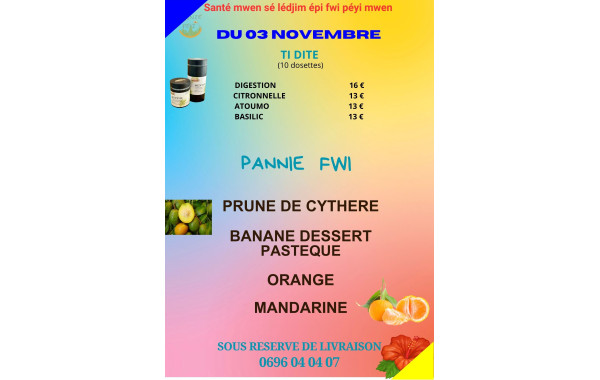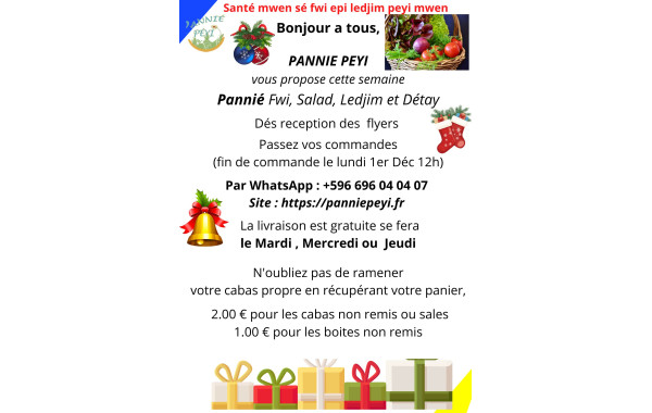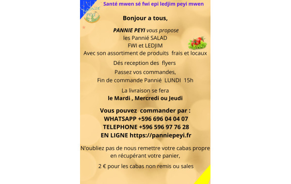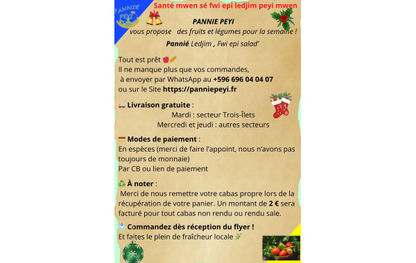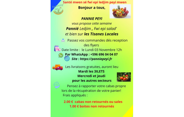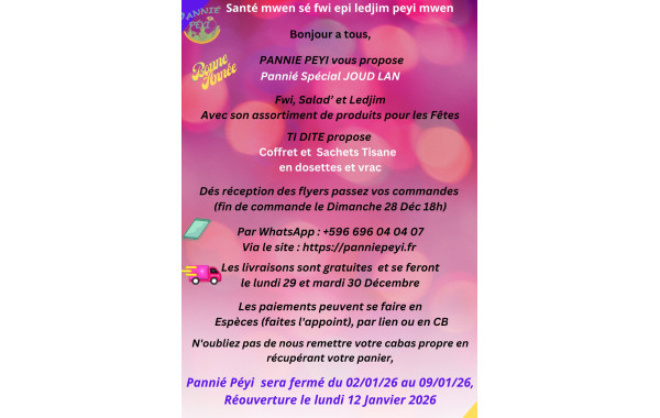 Pannié Péyi livre gratuitement en Martinique les mardis, mercredis et jeudi. Pour le click & collect les mercredis et jeudis.